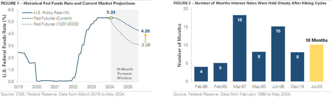 The market pushed back the expected timing of the first rate cut as inflation progress slowed. As shown in Figure 1, investors now expect only one rate cut in 2024, down from six at the start of this year. Moreover, the first rate cut is not expected until Q4. If the market’s forecast is accurate and the Federal Reserve does not cut until December, a total of 17 months will have passed between the last rate hike and the first rate cut. How does this compare to history? Figure 2 graphs the time between the last hike and the first cut across prior tightening cycles. These ‘pause periods’ ranged from four months in 1989 to as long as 15 months in 2006 and 18 months in 1997. Compared to prior cycles, the current 10-month pause is longer than average. While the pause is longer than expected, history shows it’s not unprecedented.