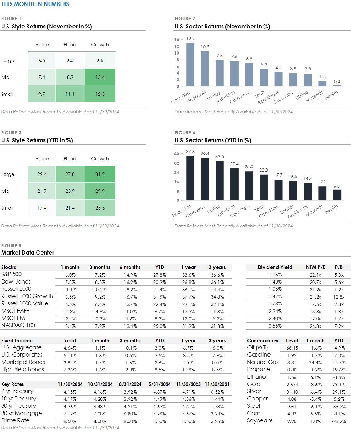 The U.S. presidential election results fueled November’s stock market rally, as investors focused on the incoming administration’s policy agenda and its implications. The S&P 500 gained +6.0%, its biggest monthly return since November 2023. The index traded above the key 6,000 level and set a new all-time high, bringing its year-to-date return to +27%. Smaller companies took center stage during the broad market rally, with the Russell 2000 surging +11.1% to set a record high. In the bond market, Treasury yields rose after the election due to concerns about increased fiscal spending, tax cuts, and large fiscal deficits under the next administration. However, later in the month, yields reversed lower, and bonds posted positive returns. With Republicans taking control of the White House, Senate, and House in January, the following section discusses key policy areas to watch, along with the potential market and economic impacts.
