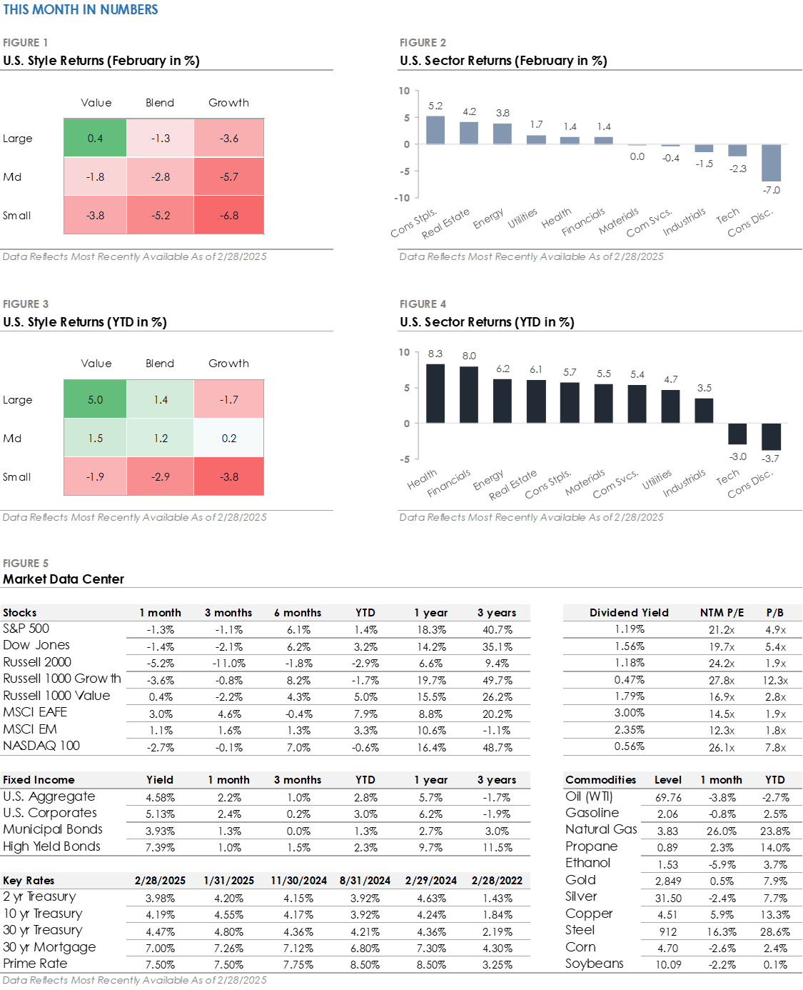 Following the election, the market initially focused on the incoming administration’s pro-growth policies. Expectations for tax cuts, deregulation, and increased energy production fueled hopes for stronger U.S. economic growth. At the start of the year, investors were optimistic about a “Goldilocks” scenario—moderate growth, cooling inflation, and lower interest rates. The optimism propelled stocks to new record highs this year, but with economic and policy uncertainty building, investor sentiment has become more cautious. The focus has now shifted from solid earnings growth and a robust labor market to concerns about slowing economic growth and uncertain government policy.
